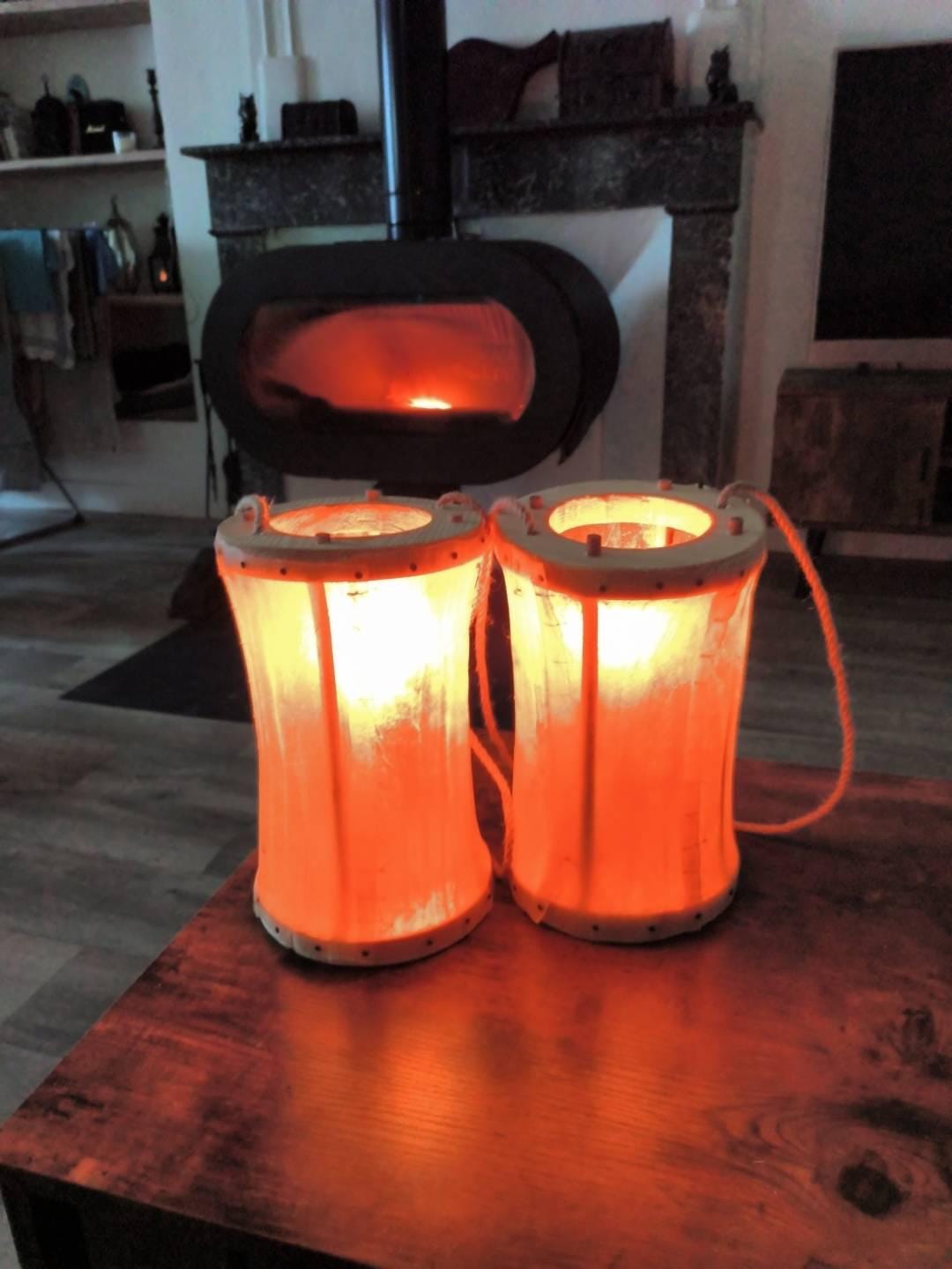 The lantern is handmade by us. It is made entirely of natural material. Each lantern is unique as the skins used are different in thickness, so each lamp looks a little different. The skin is sewn with linen thread.